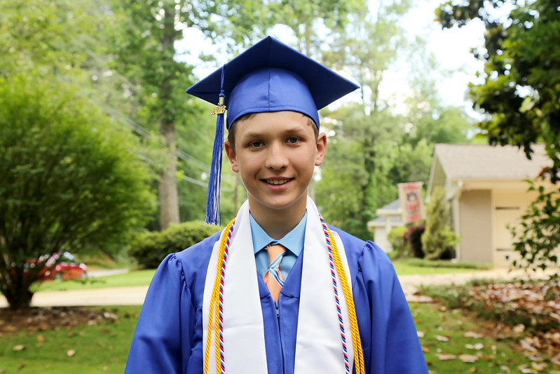 The day of Drew’s graduation I worked half a day and then came home and feverishly got everything ready for our family to show up. This wasn’t really anything major, I just had finger foods because we knew we wouldn’t have time to go out and eat. After that we went outside to get pics next to the yard sign. He’s examining what pictures I had on display. I just collected photos that weren’t already in photo albums and placed them on a cork board. I also had a running slide show on the tv. Here’s a better shot of…
